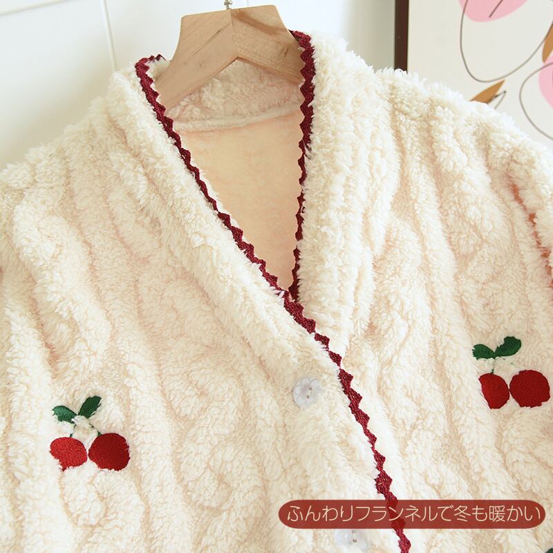 冬のコーラルフリース レディースパジャマセット フランネル 女性用 パジャマセット スリープウェア 温活 快適 かわいい ふんわり ゆったりサイズ くらんぼの刺繍 ベージュ 自宅リラックス 自宅用 セット 通気性 L M XL 無地 プレゼント ボタン | airastore