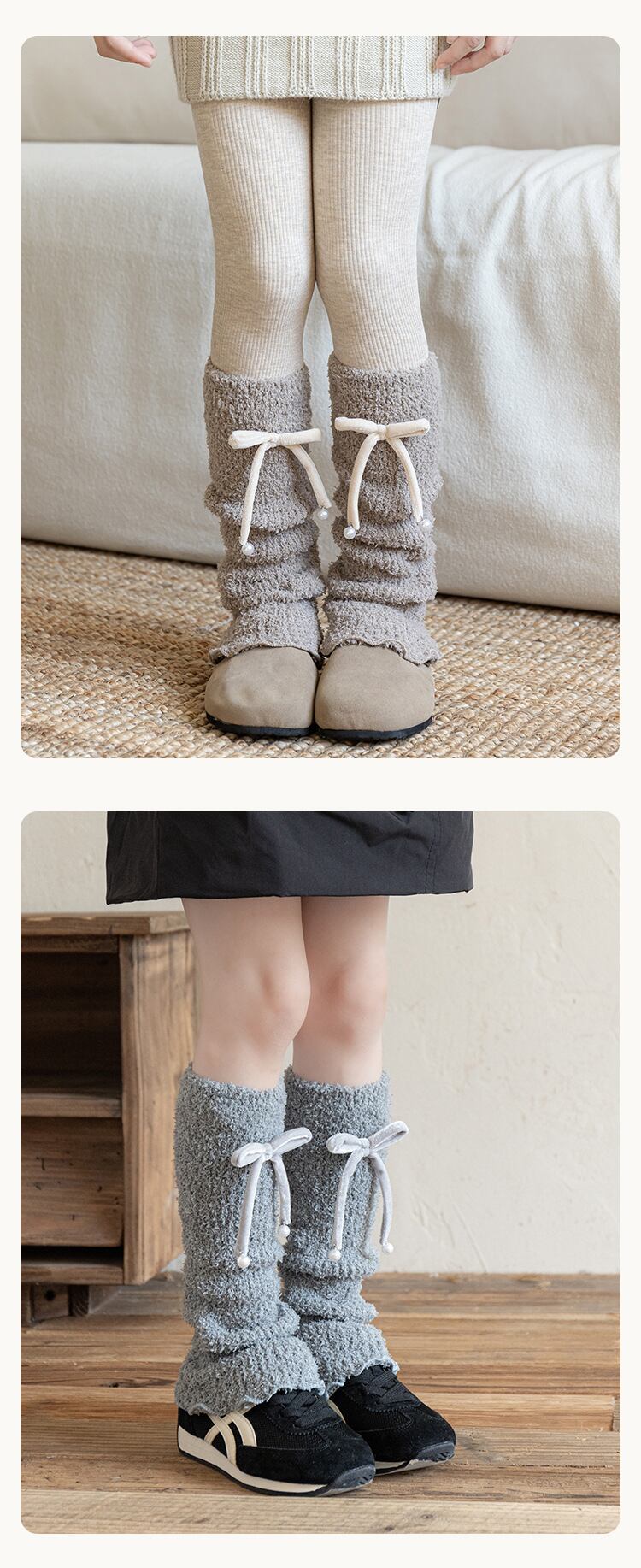 足元から描く、大人のゆるかわスタイル。ベルベットリボンがさりげなく輝くレッグウォーマー。