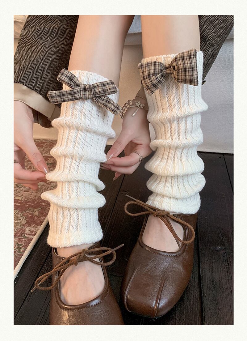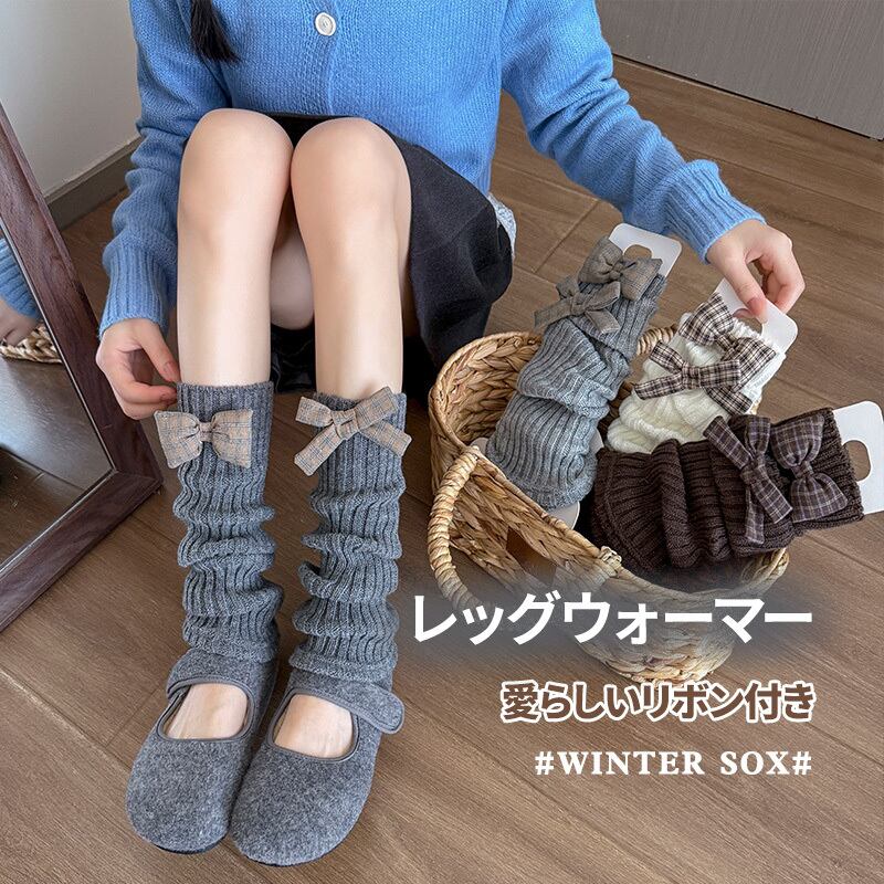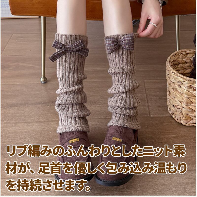 レッグウォーマー ニット リブ編み チェック柄 リボン ホワイト ブラック グレー ブラウン 冷え対策 保温 防寒 足首ウォーマー 冷え取り レディース 学生 可愛い 上品 おしゃれ ルーズソックス風 ニット ソックス レッグ 防寒対策 冷え防止 通学 女性 冬用