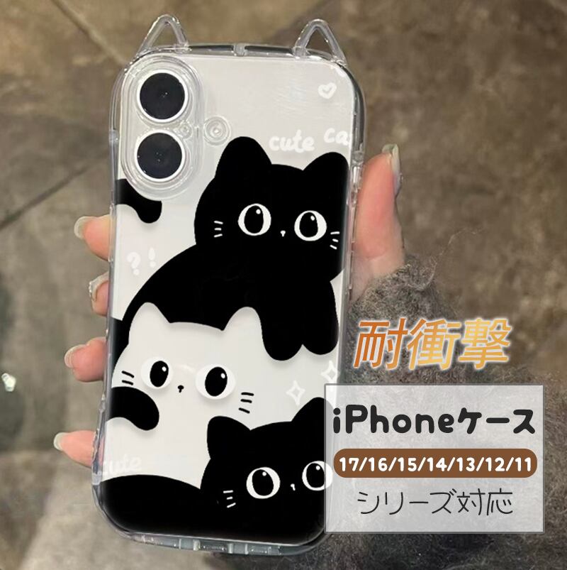 スマホケース 透明 猫耳 ブラック×ホワイト キャット 可愛い アイフォンケース iPhone 17 Air PRO MAX Plus iphone17 16 15 14 13 12 11 携帯カバー 傷防止 汚れ防止 かわいい 韓国風 オシャレ 軽量 脱着簡単 INS風 大人気