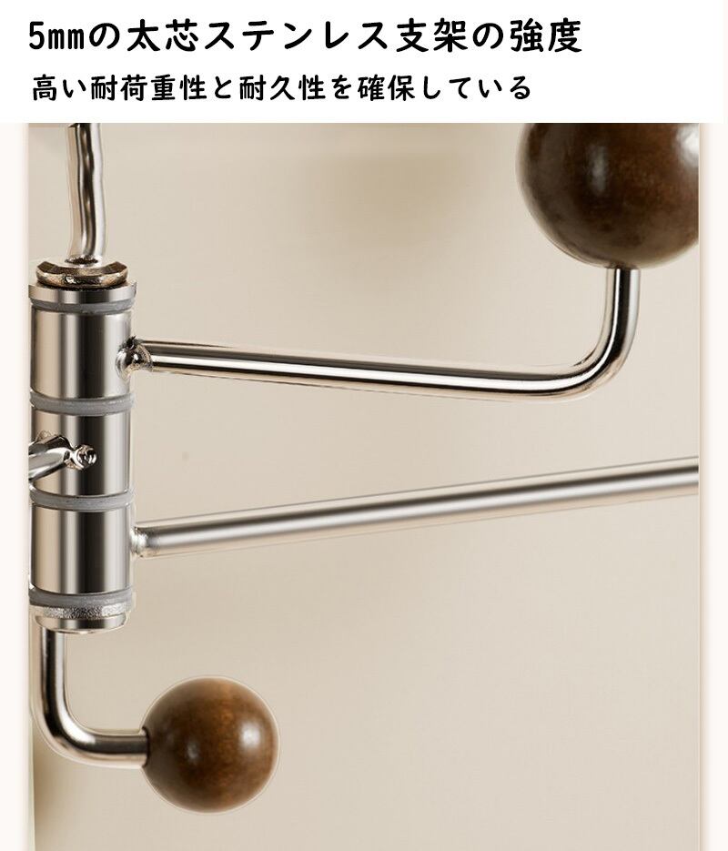 180度自由に広がるアームが、デッドスペースを「見せる収納」へ。 深みのあるウォールナットとステンレスの輝きが、玄関やキッチンをヴィンテージモダンな空間に仕立てます。
