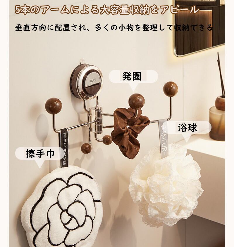 回転フック 吸盤フック 5連 壁掛け ウォールハンガー 穴あけ不要 ステンレス 180度可動式 帽子掛け キーフック キッチンツール 浴室 タオル掛け 玄関 ドア裏 収納 錆びにくい おしゃれ レトロ モダン インテリア 雑貨 省スペース 整理整頓 浮かせる収納