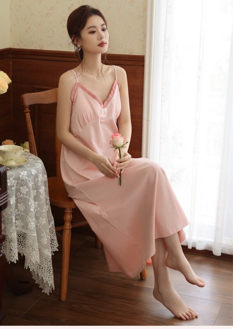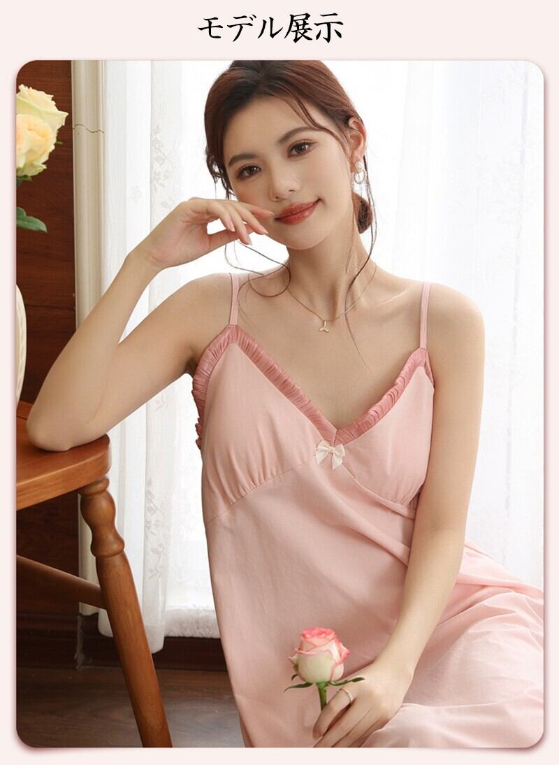 ルームウェア ネグリジェ パジャマ ワンピース キャミソール ロング マキシ丈 コットン カップ付き ブラトップ 胸パッド付き レース リボン 部屋着 ナイトウェア スリップ レディース 夏 涼しい 接触冷感 通気性 柔らかい 無地 シンプル フレンチ