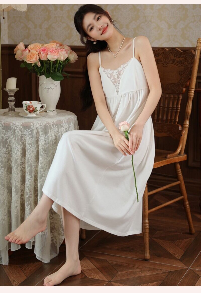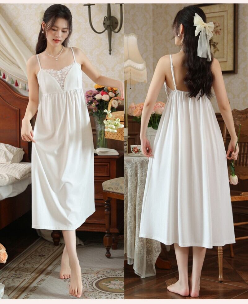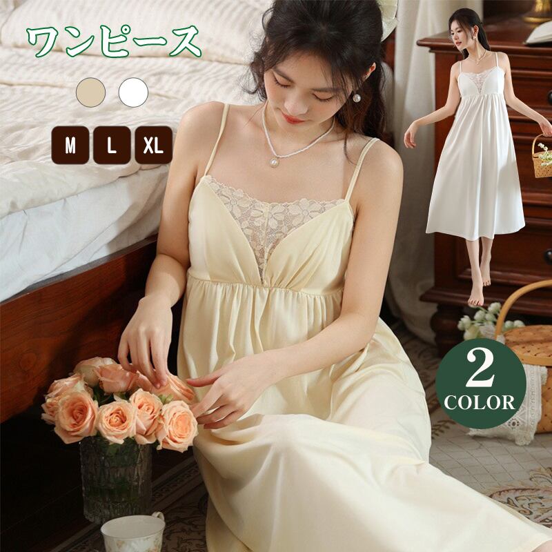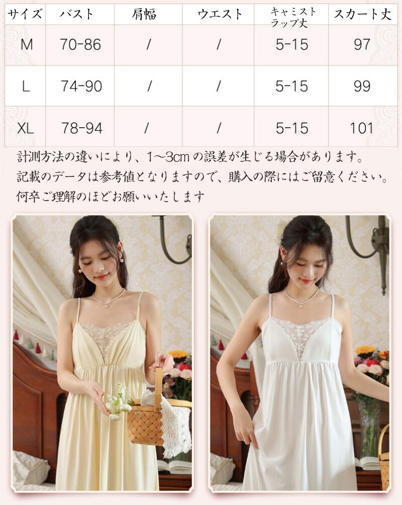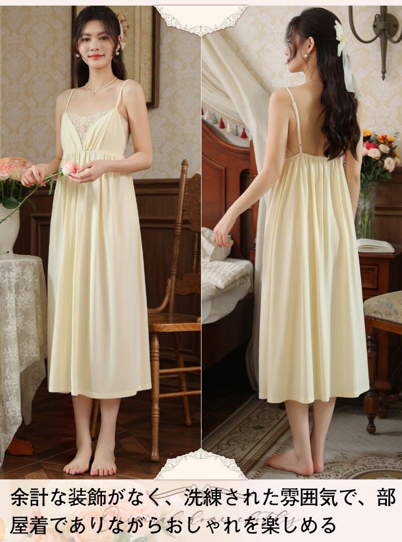 ルームウェア ネグリジェ パジャマ ワンピース キャミソール ロング ミモレ丈 コットン95% カップ付き 胸パッド付き レース ギャザー Aライン 部屋着 ナイトウェア スリップ レディース 夏 涼しい 接触冷感 柔らかい 伸縮性 姫系 プリンセス セクシー