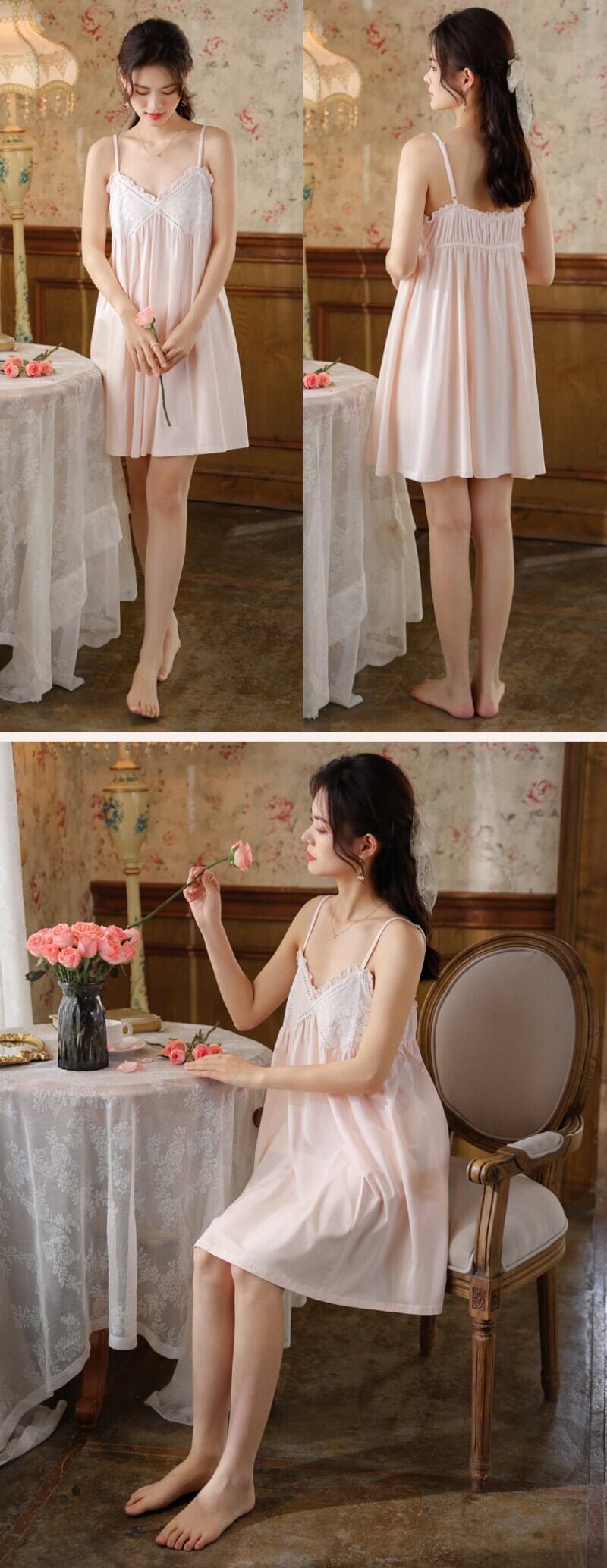 【5色展開 選べる2丈】 ルームウェア ネグリジェ パジャマ ワンピース キャミソール ショート ロング ミモレ丈 コットン レース 部屋着 ナイトウェア スリップ 夏 涼しい 姫系 セクシー ロリータ 旅行 お泊まり ホワイト パープル ピンク ブルー