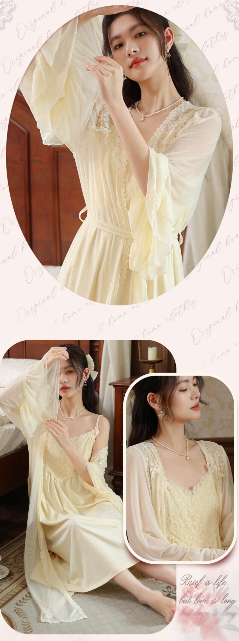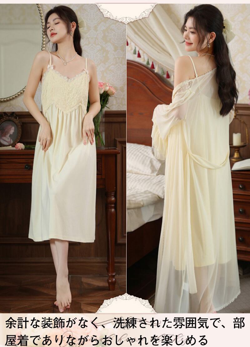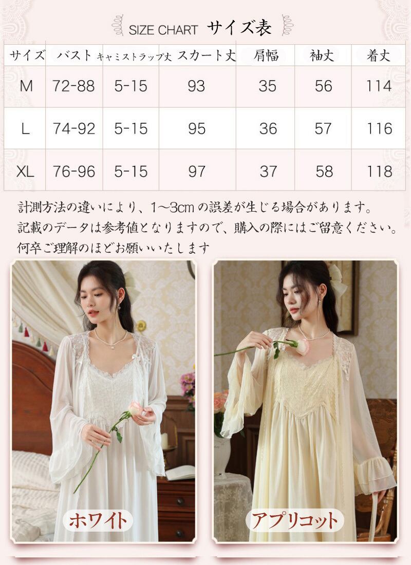 ルームウェア レディース パジャマ ネグリジェ 2点セット カップ付き 長袖 ナイトガウン キャミソール ワンピース ロング丈 レース チュール メッシュ 宮廷風 お姫様 フランス風 セクシー 春 秋 部屋着 羽織り ナイトウェア ホワイト アプリコット M L X