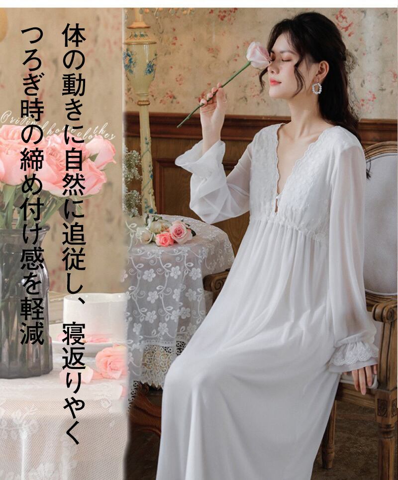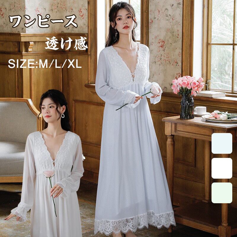 ルームウェア ネグリジェ ワンピース 長袖 マキシ丈 カップ付き レース チュール Vネック 姫系 宮廷風 レディース パジャマ ナイトウェア 部屋着 春 秋 セクシー 大人可愛い フェミニン ホワイト ライトブルー ライトグリーン M L XL