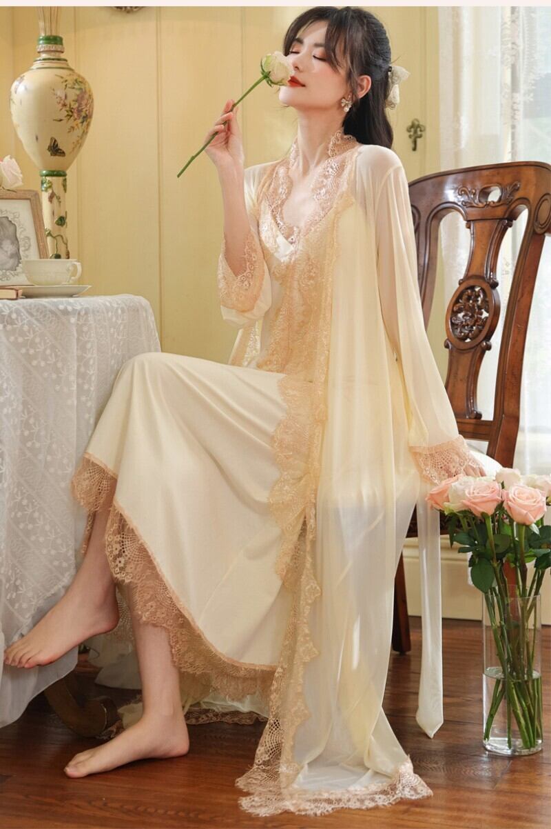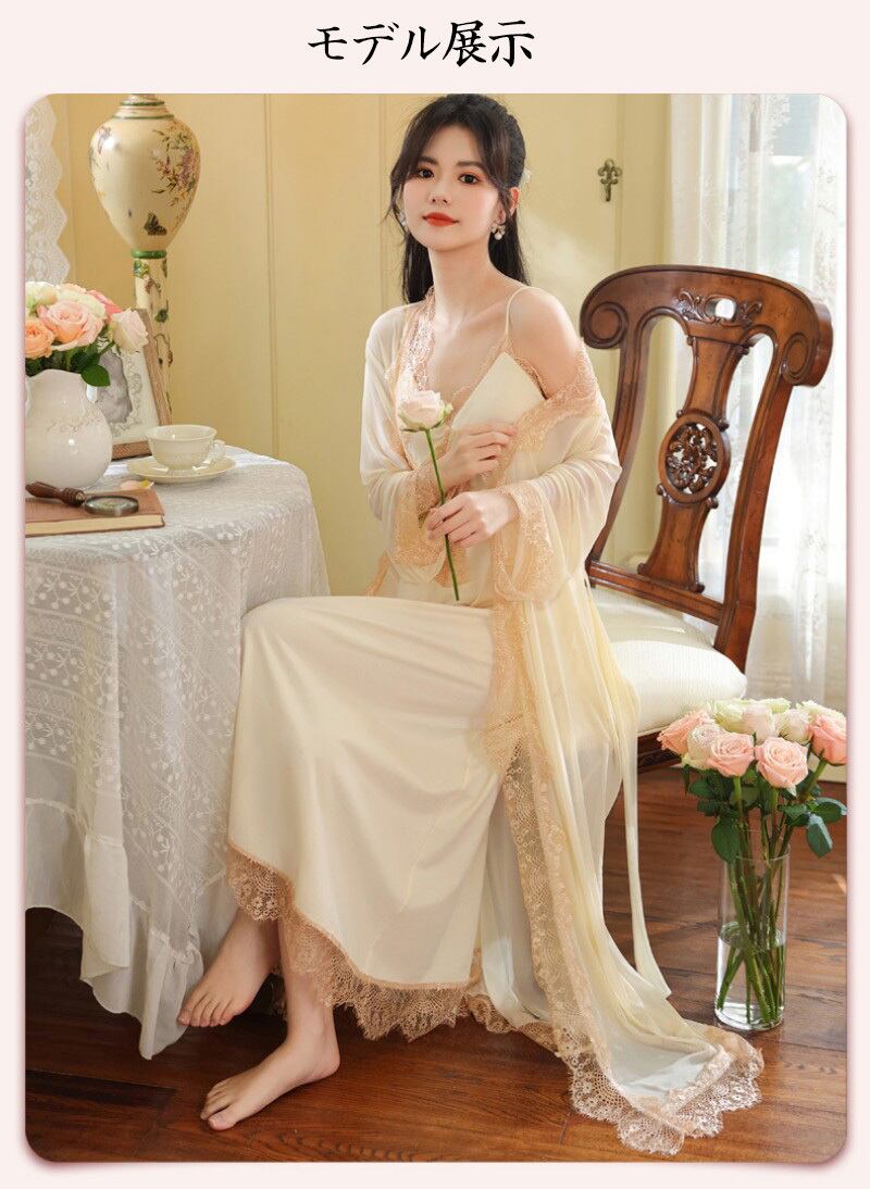 ルームウェア レディース パジャマ ネグリジェ 2点セット カップ付き 長袖 ガウン キャミソール ワンピース マキシ丈 ロング レース チュール メッシュ 宮廷風 姫系 セクシー 春 秋 部屋着 ナイトウェア ホワイト アプリコット M L XL ギフト プレゼント