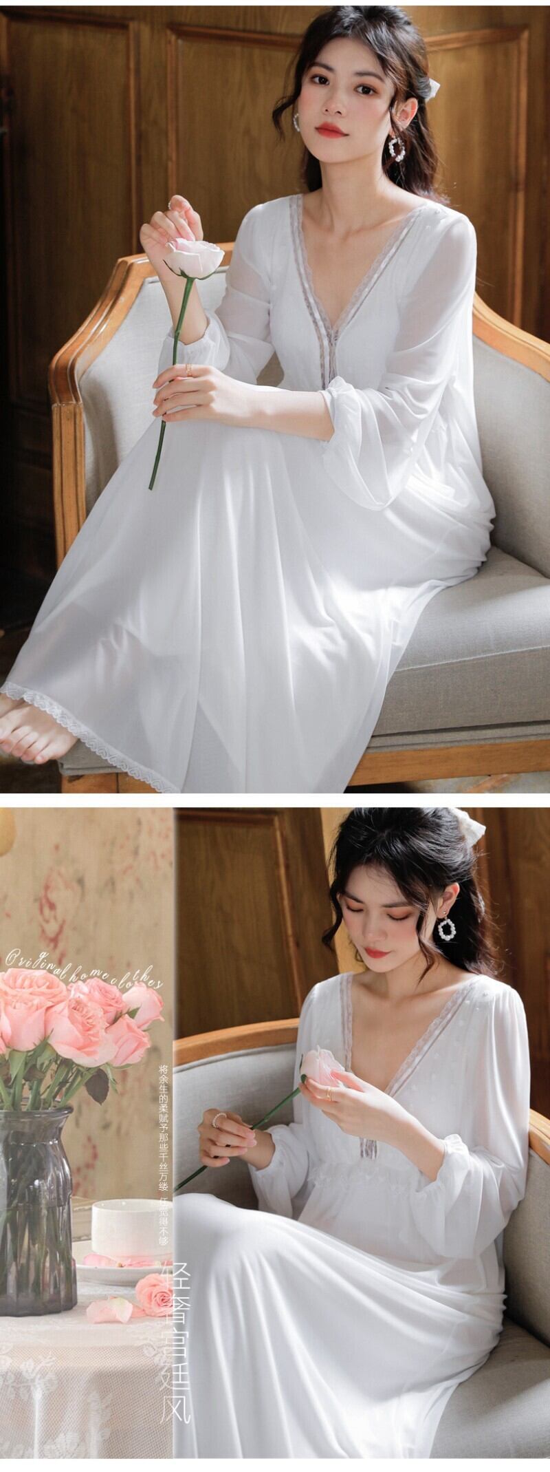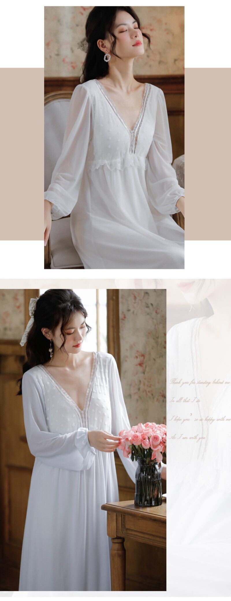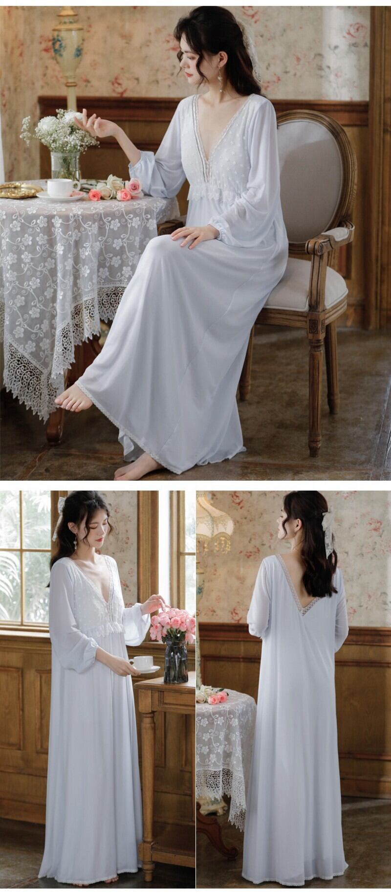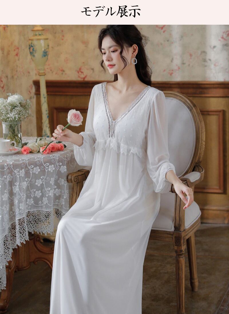 ルームウェア ネグリジェ ワンピース 長袖 マキシ丈 カップ付き ビスコース レース チュール Vネック 姫系 宮廷風 レディース パジャマ ナイトウェア 部屋着 春 秋 セクシー 大人可愛い フェミニン ホワイト ライトブルー ライトグリーン M L XL