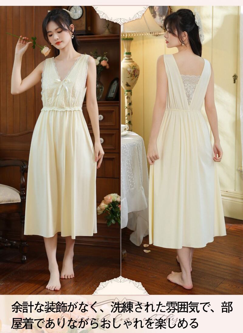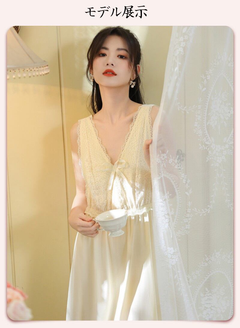 ルームウェア ネグリジェ ワンピース ノースリーブ カップ付き ロング丈 マキシ丈 レース リボン Vネック 姫系 宮廷風 レディース パジャマ ナイトウェア 部屋着 夏 春 涼しい 可愛い セクシー 清楚 大人 ガーリー ホワイト アプリコット M L XL
