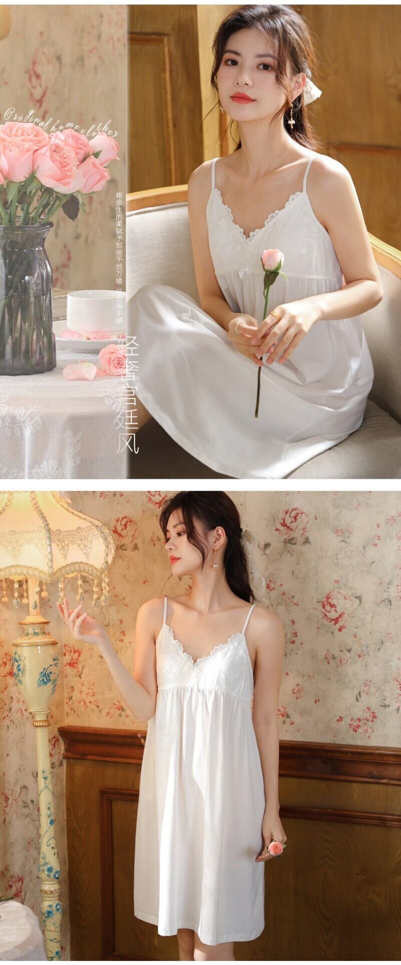 ルームウェア ネグリジェ ワンピース キャミソール カップ付き レース 刺繍 フリル 膝丈 ミニ丈 姫系 宮廷風 レディース パジャマ ナイトウェア 部屋着 夏 春 涼しい 可愛い セクシー 清楚 大人 ガーリー ホワイト ライトブルー M L XL
