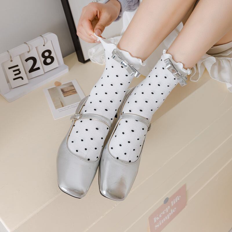 【3足セット】 靴下 レディース ソックス クルーソックス ミドル丈 水玉 ドット柄 リボン フリル おしゃれ かわいい JK スクール ガールズ 学生 制服 コスプレ ロリータ 韓国 ファッション 春 秋 冬 黒 白 グレー プレゼント ギフト