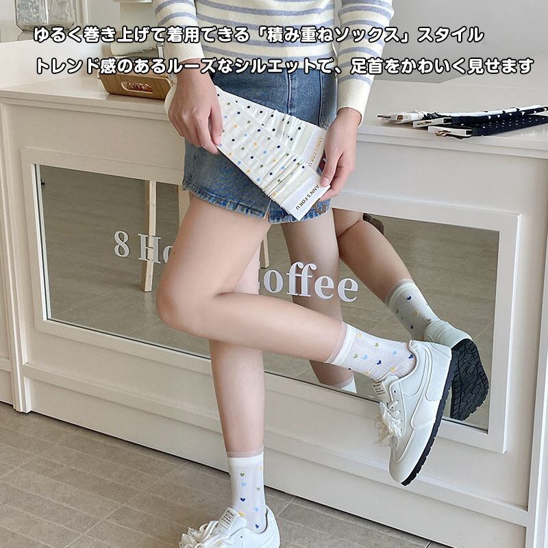 3足セット 靴下 レディース ソックス ハート ドット 水玉 柄 チュール フリル リブ クルーソックス ミドル丈 薄手 メッシュ 通気性 おしゃれ かわいい 韓国 ファッション 黒 白 春 夏 秋 学生 通学