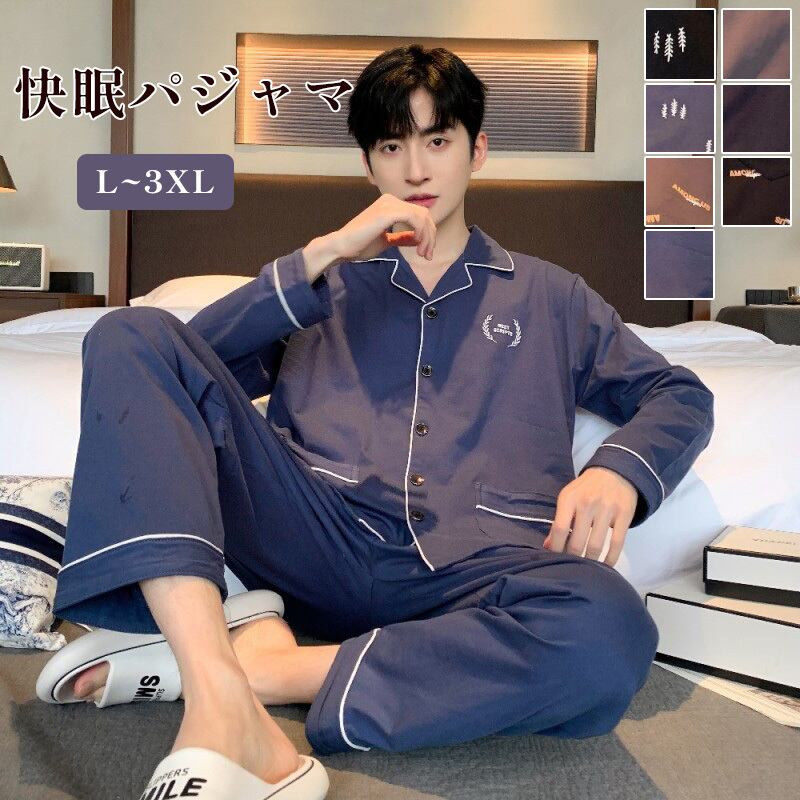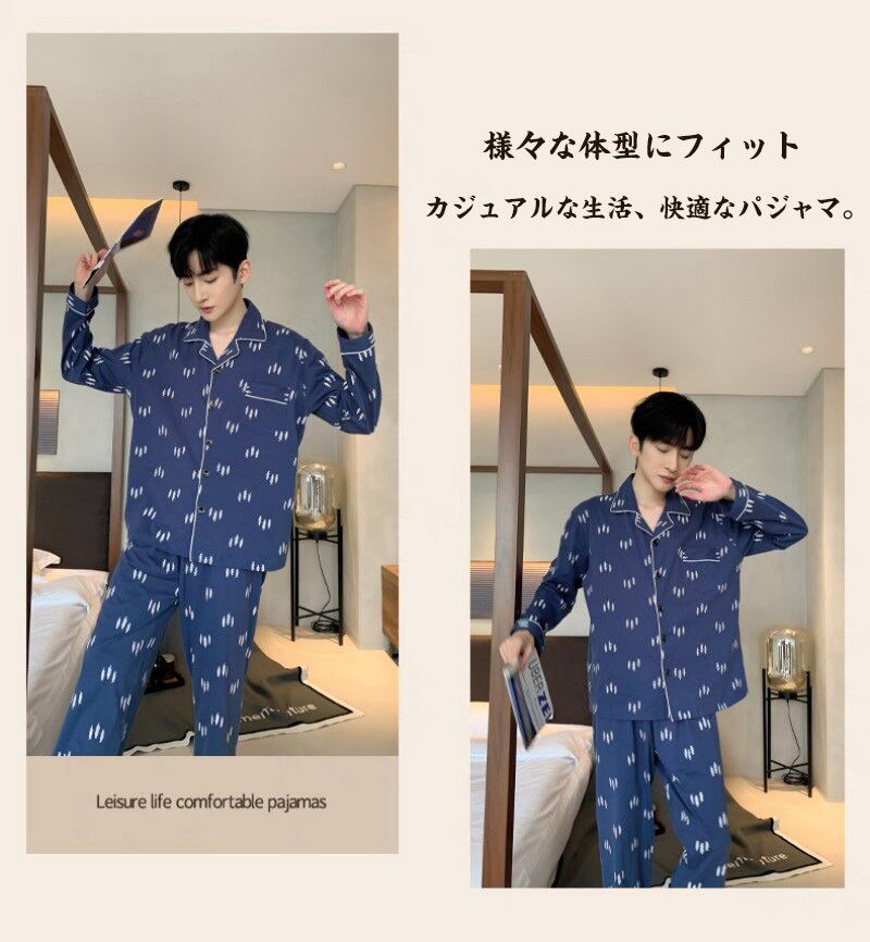 パジャマ メンズ コットン100% 長袖 長ズボン 上下セット 前開き 襟付き ルームウェア 春 秋 部屋着 紳士 男性 吸水 通気 快適 おしゃれ ポケット パイピング 無地 総柄 大きいサイズ L XL 2XL 3XL 父の日 ギフト プレゼント