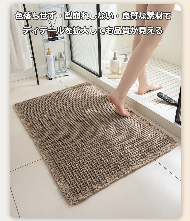 トレンドの「クリームスタイル」カラーが、洗面所や玄関を明るく柔らかな雰囲気に。 洗濯機で丸洗いでき、裏面は強力な滑り止め付き。