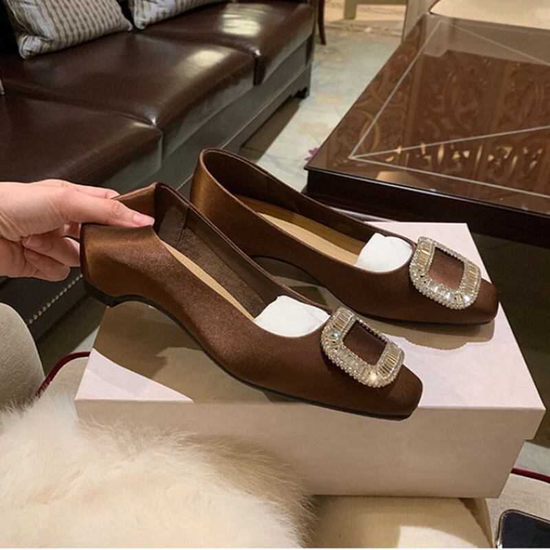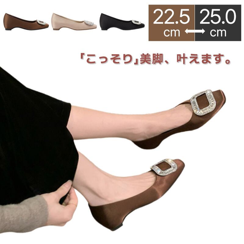 パンプス インヒール 4.5cm シークレットシューズ レディース ビジュー バックル サテン スクエアトゥ ぺたんこ風 痛くない 歩きやすい 柔らかい キラキラ おしゃれ 結婚式 パーティー フラットシューズ ローヒール 美脚 春 夏 秋 冬 黒 ブラウン シャンパン