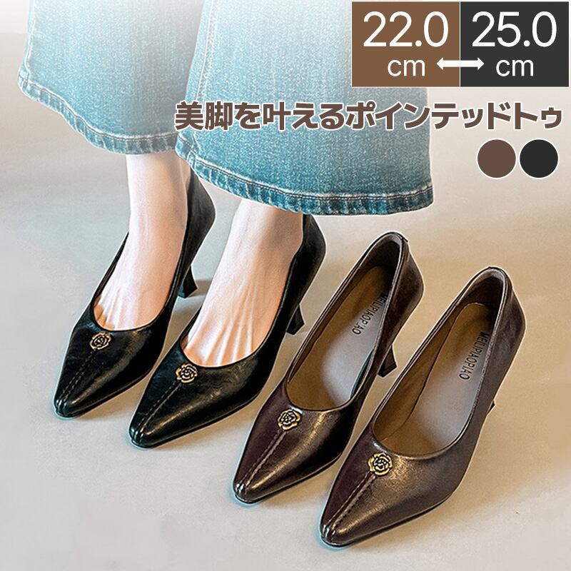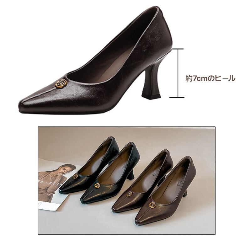 パンプス ポインテッドトゥ ハイヒール 7cm ヒール カメリア 花 フラワーモチーフ レディース ピンヒール 痛くない 柔らかい 歩きやすい 美脚 脚長 おしゃれ 上品 きれいめ 結婚式 パーティー お呼ばれ 通勤 オフィス 黒 ブラウン 2026 春 新作