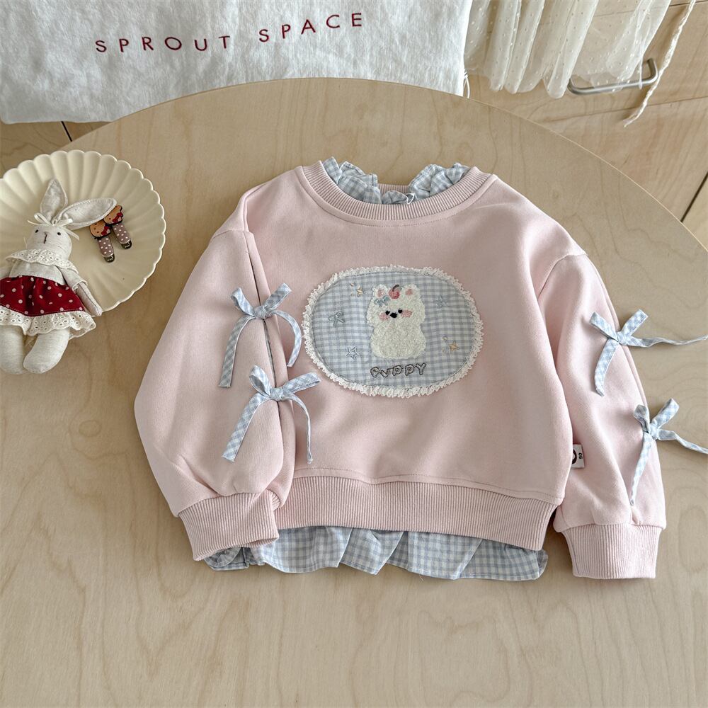 キッズ 春秋 スウェット トレーナー 子供 女の子 ツーウェイ プルオーバー クルーネック トップス ベビー 長袖 リボン 刺繍 犬モチーフ キャラクター かわいい キュート 綿 柔らかい 韓国 子供服 小学校 入学式 入園式 卒園式 90-140
