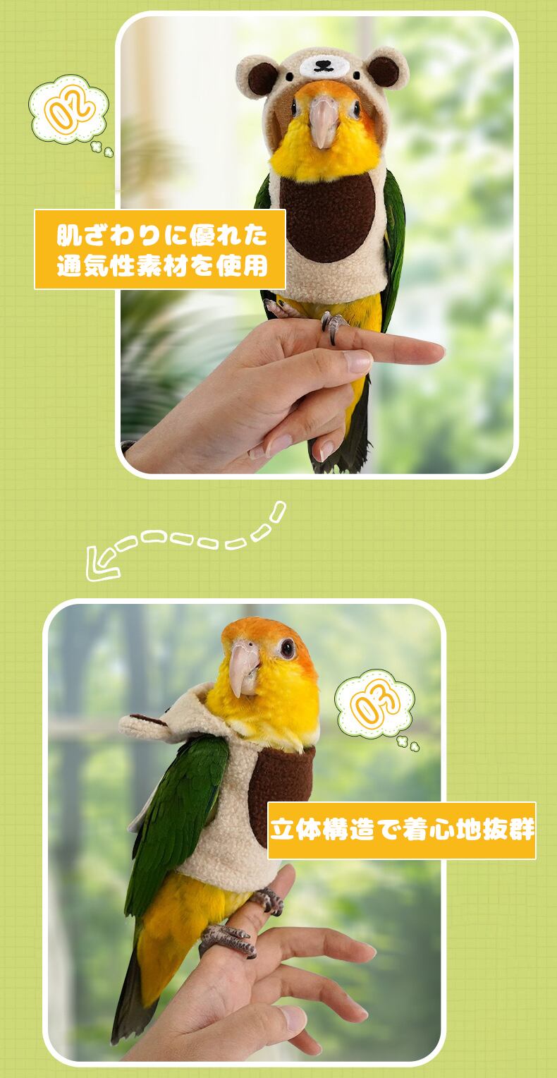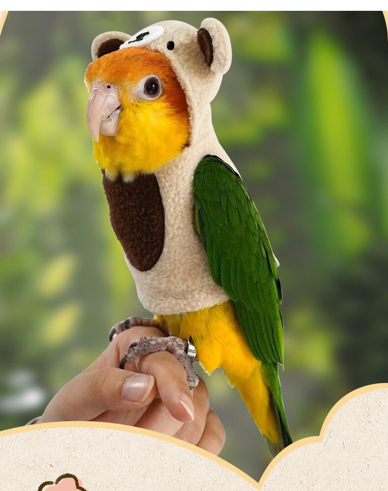 インコ用あったかペット服 ふわふわコットン素材で作られた、クマ耳フード付きの可愛いペット服