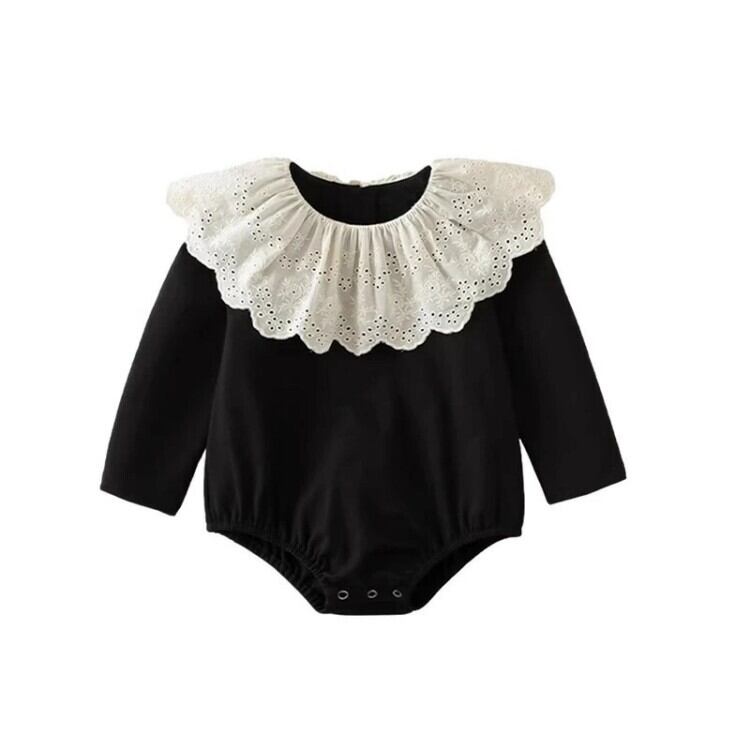 このベビー ロンパースは、レース襟がとってもおしゃれで、特別な日の装いにぴったりです。
