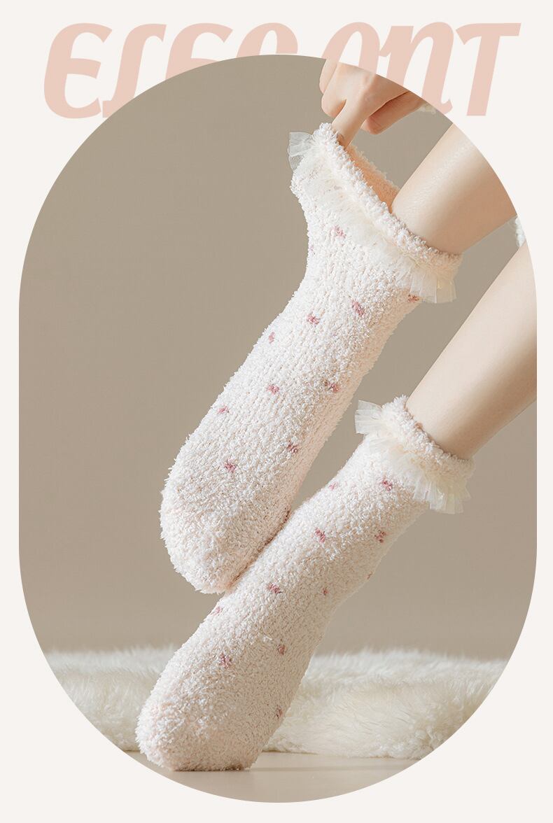 【2足セット】珊瑚フリース 中筒ソックス 靴下 ルームソックス 産後ソックス スリープソックス あったか靴下 就寝ソックス 秋冬 冬用 厚手 暖かい 保温 もこもこ 防寒 秋冬 冷え防止 冷え対策 かわいい 合わせやすい レース ドット 水玉 レディース | airastore
