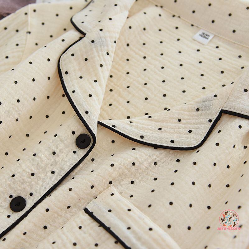 2点セット パジャマ レディース ダブルガーゼ シンプル ホームウェア ドット柄 長袖 ズボン セット ベージュ ブラウン 快適 おしゃれ ルームウェア 軽やか 寝巻き カジュアル ギフト おすすめ 春 秋 ファッション 家庭用 ゆったり 軽量 人気 | airastore