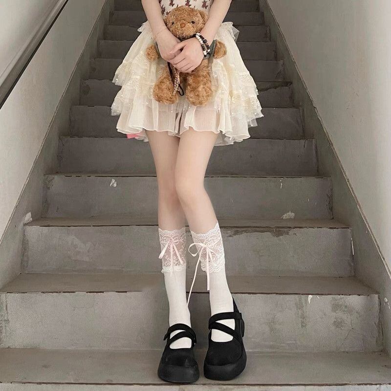 ゆめかわなリボン付きクルー丈ソックス、かわいさ満点のデザイン ソックス ストッキング レース フリル レディース ロリータ 量産型 地雷系 白 黒 かわいい タイツ リボン ゴスロリ ハイソックス 姫系 結婚式 セクシー ホワイト ブラック | airastore